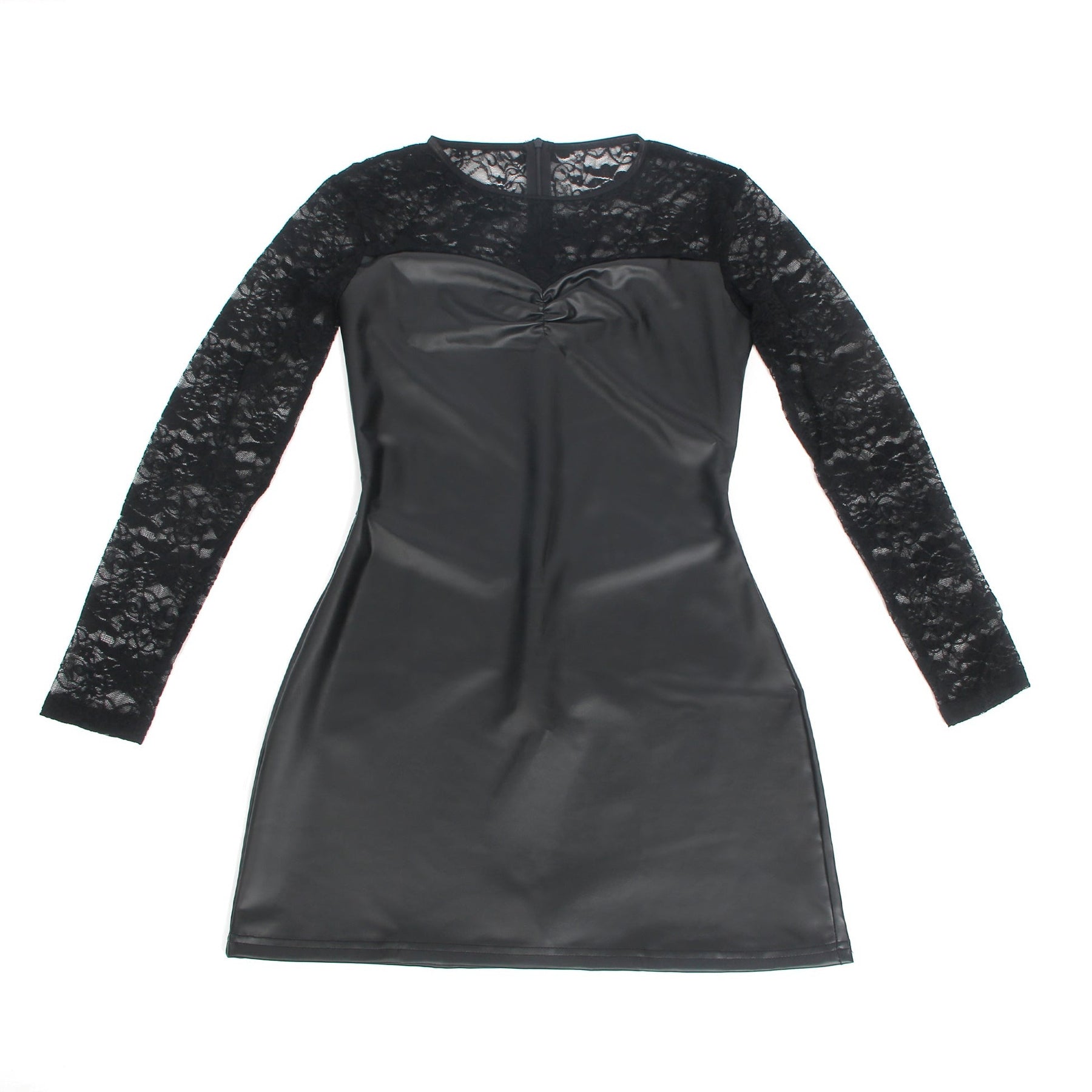 Trek de aandacht en straal elegantie uit met Celestin Noir™ Leren Lingerie, een verbluffende fusie van zachte kant en slank faux leer die verfijning met een randje definieert. Deze lichaam aansluitende mini-jurk heeft een verleidelijke kantenkraag en mouwen, gecombineerd met een gladde, glanzende leren afwerking die je rondingen perfect vormt.